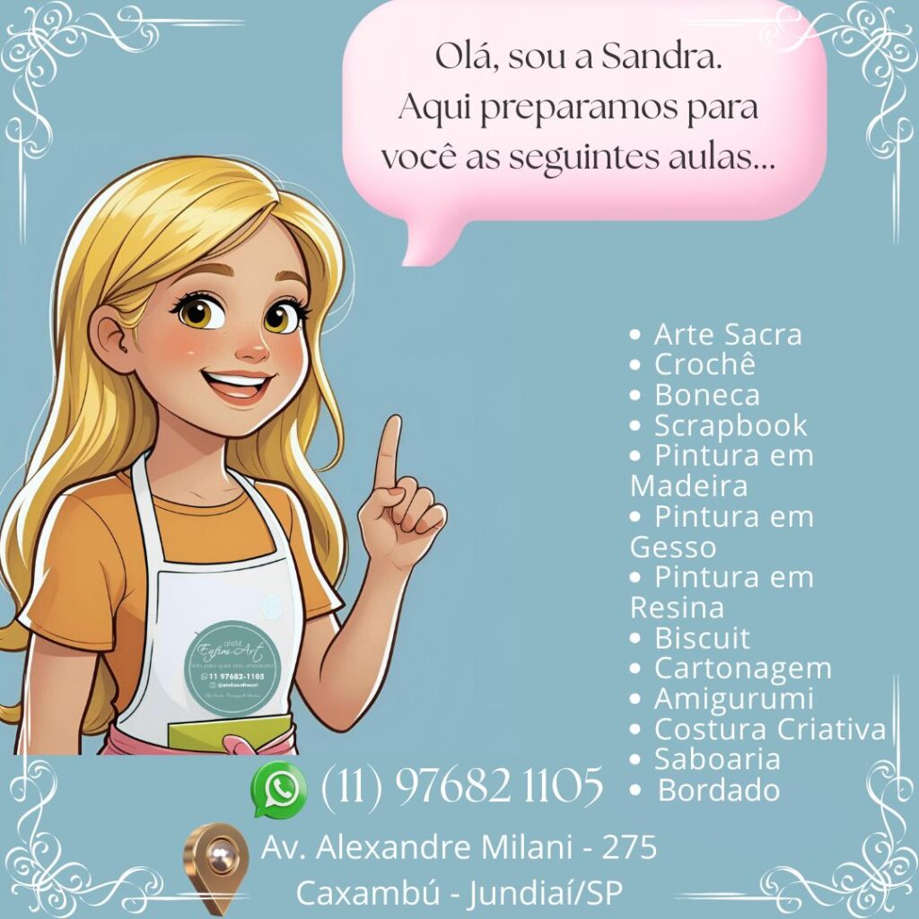 O Ateliê Enfim Art oferece várias aulas de artesanato como Pintura em Madeira, Crochê, aulas de Bordados, Cartonagem, Amigurumi, Costura Criativa, Confecção de boneca, Biscuit, entre outras.